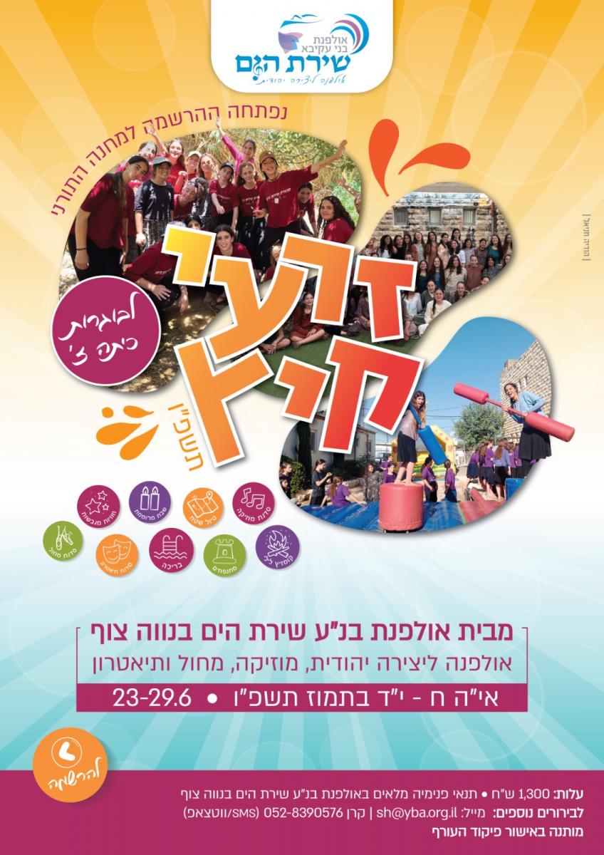 מוזמנת בשמחה כל בוגרת כיתה ז' המעוניינת להצטרף למחנה איכותי תורני ערכי אשר שם דגש על יצירה יהודית דרך אומנות הבמה (מוזיקה, מחול ותאטרון)